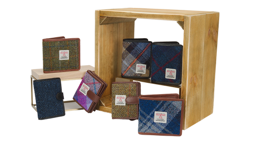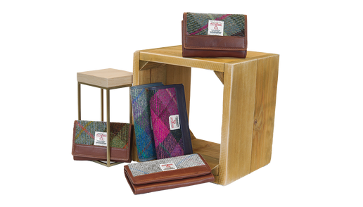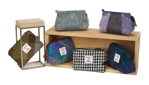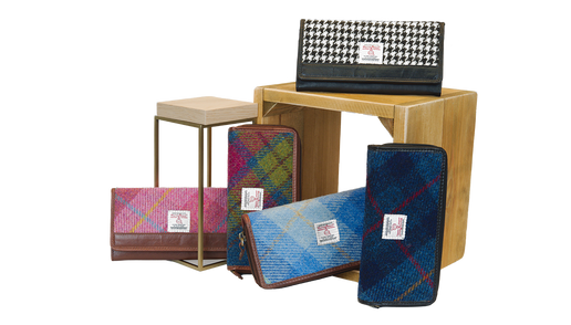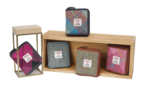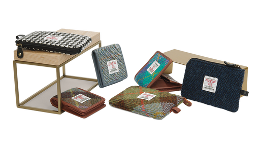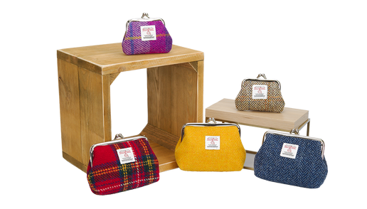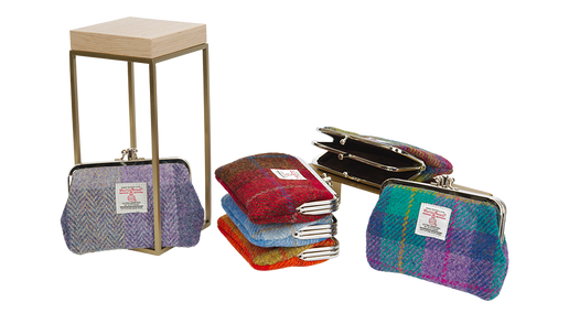 Harris Tweed® purses and wallets for everyday use. Compact, organised interiors; sturdy zips and poppers; handwoven fabric outers with subtle texture. Practical accessories that slip easily into pockets or bags while adding Scottish character.